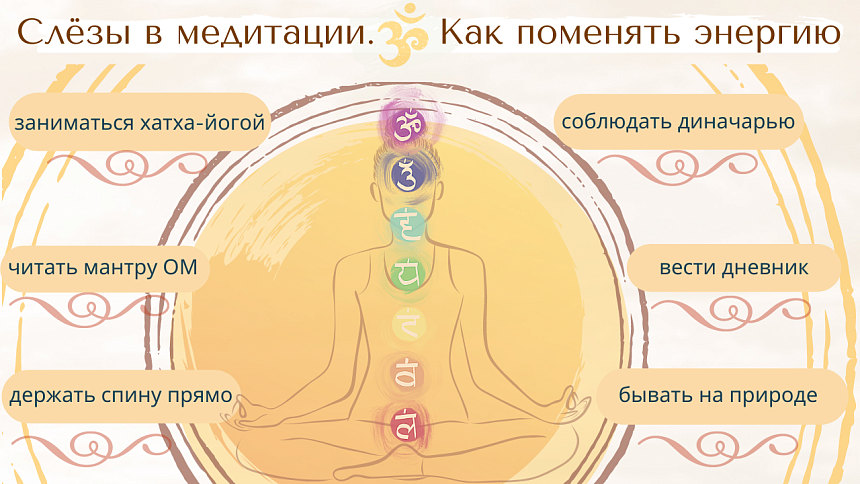 Если у человека возникают слёзы во время медитации, можно порекомендовать попробовать практику мантры «Ом».